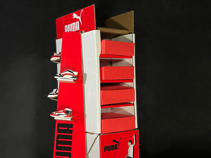 Diseño de un mueble exhibidor que evoque la identidad de la marca y el producto especifico Tenis Rebound V6 Mid . El diseño está pensado desde la producción en masa vía troquel y que será armado por un tercero, por ello, contiene un manual de instrucciones.